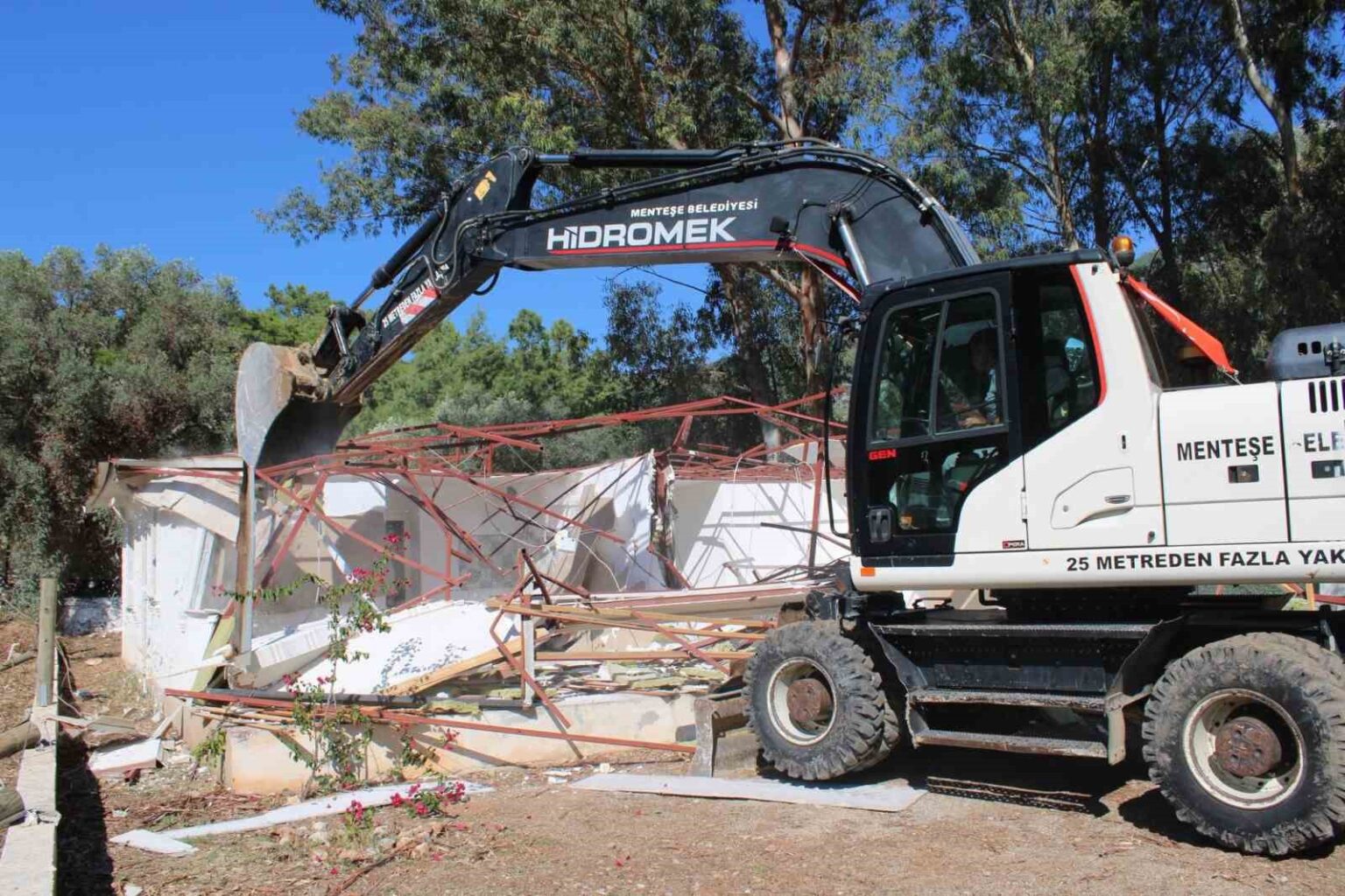 Menteşe Belediyesi ekipleri, imar kanununa aykırı olarak inşa edilen yapıların yıkımını kepçelerle gerçekleştirdi. Yıkım öncesinde belediye yetkilileri tarafından yapılarda bulunan eşyalar taşındı, elektrik tesisatları söküldü.
