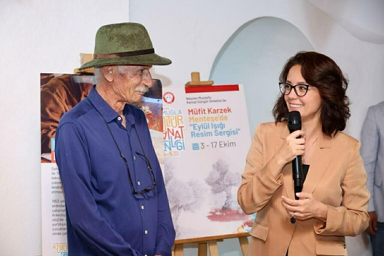 32. Uluslararası Muğla Kültür ve Sanat Şenliği kapsamında Ressam Müfit Karzek’in ‘Eylül Işığı’ isimli sergisi açıldı. Tarihi Sekibaşı Hamamı’nda sanatseverlerle buluşan serginin açılışında konuşan Menteşe Belediye Başkanı Gonca Köksal Aras, “Çok kıymetli bir sanatçımızla, tarihi Sekibaşı Hamamımızda birlikteyiz. Müfit Hocamızın Muğla’da bizlerle olması bizim için büyük bir onur. Kendine has tekniğiyle özellikle zeytin ağaçlarını resmeden Müfit Hocamız, bize hem estetik hem de simgesel bir değer sunuyor. Zeytin; barışın ve kardeşliğin sembolü olduğu kadar, son yıllarda direnişin ve mücadelenin de simgesi haline geldi. Geçtiğimiz günlerde binlerce vatandaşımızla birlikte ‘Toprağımızı vermiyoruz’ mitinginde bu mücadeleyi haykırdık. Ben de çocuklarımıza doğayı sevdirmek ve köklü mirasımız zeytini tanıtmak amacıyla bir çocuk kitabı kaleme aldım. Çok yakında basılacak. Bugün burada bizlerle birlikte olan yine çok değerli bir sanatçımız var. Neyzen Mustafa Kemal Güngör” dedi.