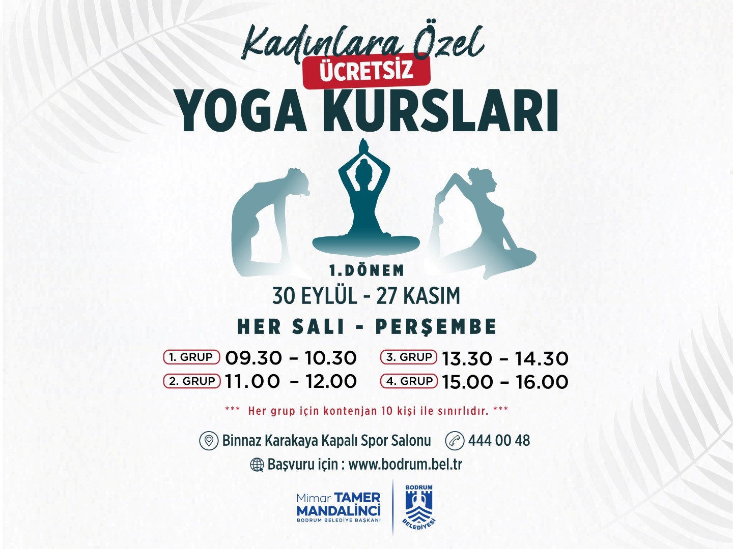 Bodrum Belediyesi Kültür ve Sosyal İşler Müdürlüğü tarafından “Kendinle Buluş, Nefes Al, Güçlen” sloganıyla hayata geçirilen kursların birinci dönemi 30 Eylül ile 27 Kasım tarihleri arasında düzenlenecek. Salı ve Perşembe günleri yapılacak olan kurslar, alanında uzman eğitmenler eşliğinde dört farklı grup halinde gerçekleştirilecek. Her biri 10 kişilik gruplardan oluşan, iki aylık periyotlarla düzenlenen ve her dönem yeni katılımcılara açık olan yoga kursları, ücretsiz olarak verilecek ve kontenjanla sınırlı olacak.
