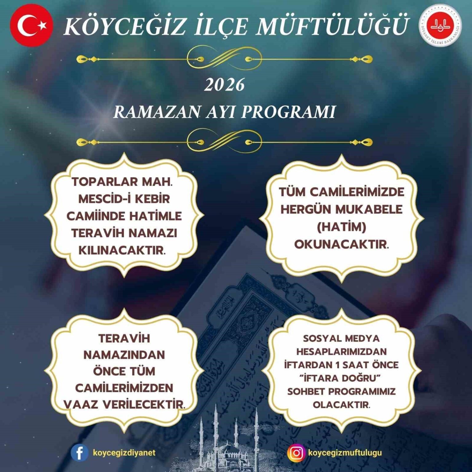 18 Şubat 2026 Çarşamba günü akşam ilk teravih namazı kılınıp gecesinde ilk sahur yapılıp 19 Şubat 2026 Perşembe günü de farz olan Ramazan orucu tutulacak. Köyceğiz’de Diyanet İşleri Başkanlığının belirlediği 2026 yılı Ramazan Ayı teması olan “Ramazan Cami ve Hayat” kapsamında gündüzleri oruç ile teravihler, mukabeleler, sahurlar, iftarlar, fitreler, zekatlar, fidyeler, yardımlar ile Ramazan ayı anlamlı ve unutulmaz kılınacak. Bu sene de Köyceğiz’de Hatimle teravih namazı kılınmaya devam edilecek olup Toparlar Mescid-i Kebir Camiinde Uzman İmam-Hatip Hafız Ramazan Tokcan Hoca camisinde ramazan ayı boyunca hatimle teravih namazlarını kıldıracak. Köyceğiz İlçe Müftülüğünden yapılan açıklamada; “Ramazan ayının kalplerimize huzur, hanelerimize bereket, ailemize, Köyceğiz’imize, Muğla’mıza, ülkemize ve İslâm alemine hayırlar getirmesini temenni ediyoruz. Başta Filistinli kardeşlerimiz olmak üzere tüm zulüm altında olan kardeşlerimizin de biran evvel huzura kavuşmalarını Rabb’imizden niyaz ediyoruz. Hoş geldin on bir ayın sultanı ya Şehr-i Ramazan” ifadeleri kullanıldı.