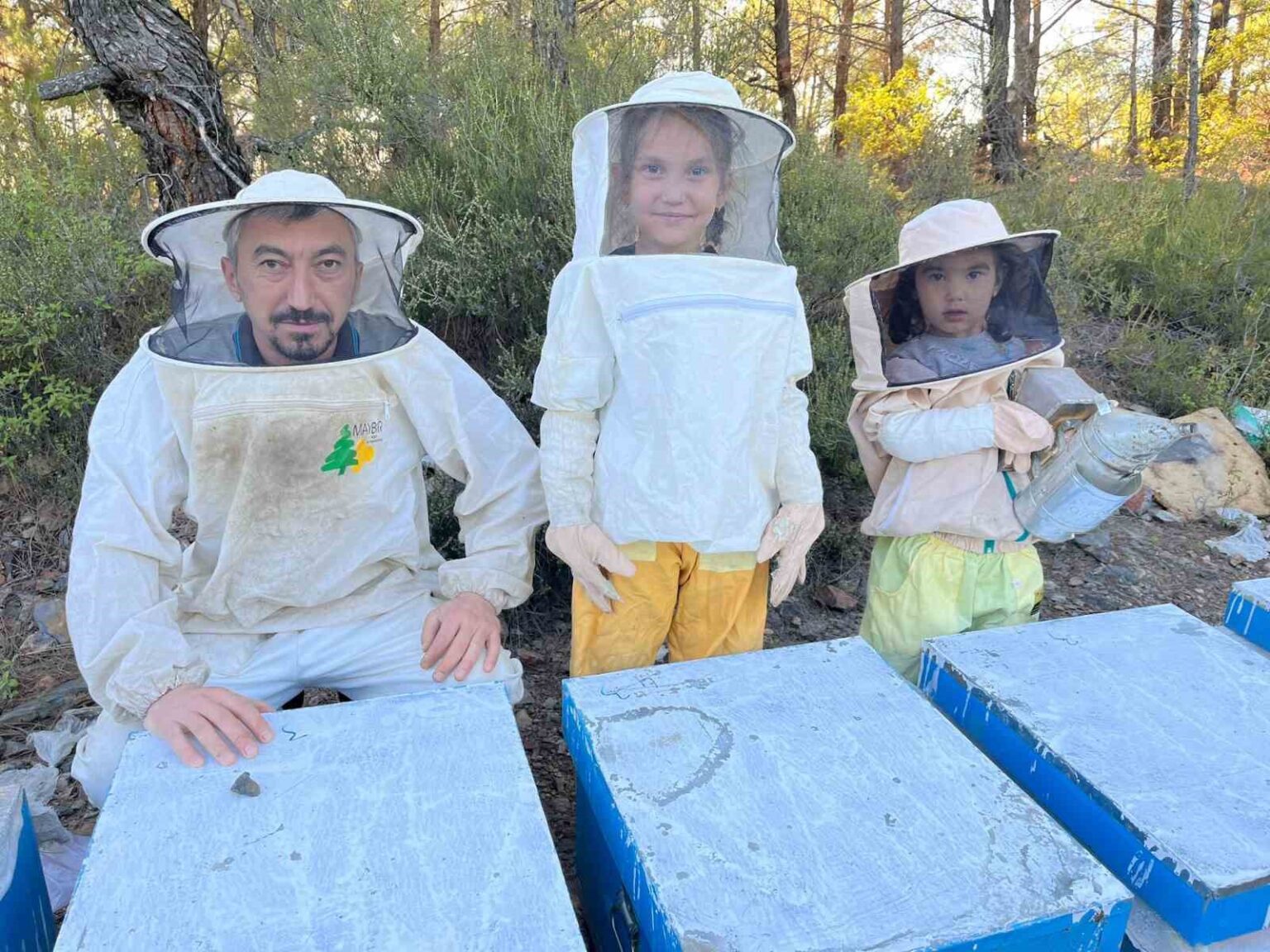 Muğla’nın Yatağan ilçesinde arıcılıkla uğraşan Servet Çıldır’ın 6 ve 3 yaşındaki kızları küçük yaşlarına rağmen babalarına arıcılık işlerinde yardım ederek örnek oluyor.